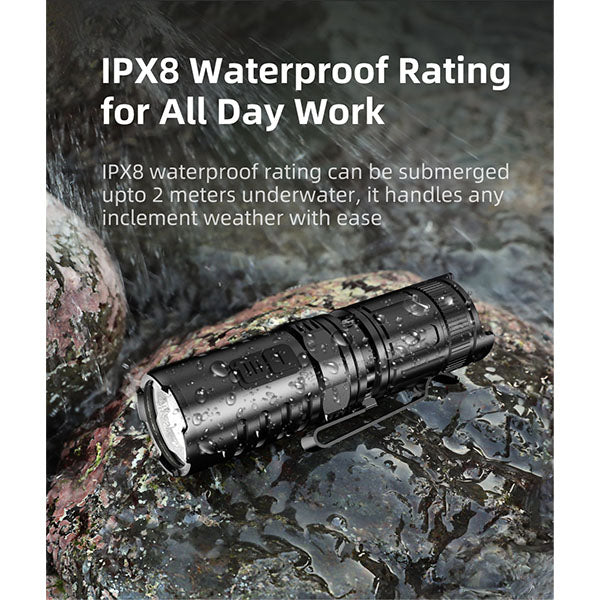 Die IPX8 Wasserdichtigkeitsbewertung erlaubt das Eintauchen bis zu 2 Metern unter Wasser. Die U-förmige Endkappe ermöglicht das Aufstellen auf flachem Untergrund und ist auch für die Verwendung eines Stirnbands geeignet.
