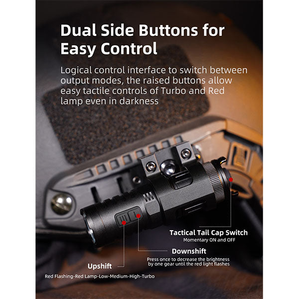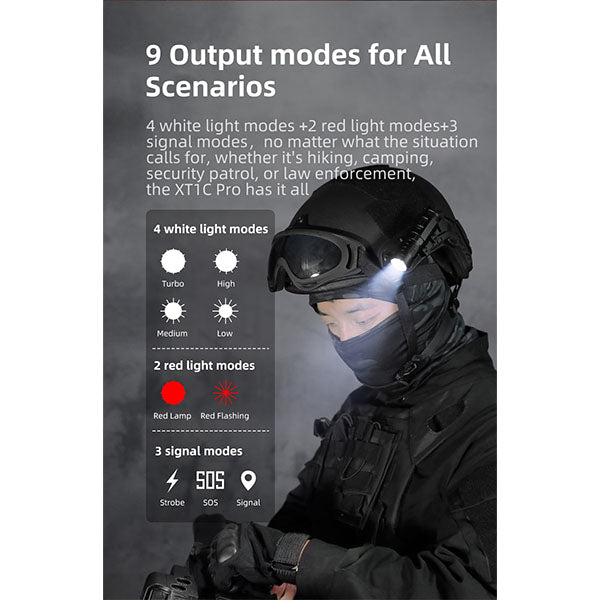 Federleicht mit nur 58 Gramm verfügt die XT1C PRO über ein kompaktes Design für einhändige Bedienung. Der Endkappenschalter ermöglicht taktisches momentanes Ein- und Ausschalten. Die seitlichen Tasten können zur Einstellung der Leistung und zum schnellen Zugriff auf Turbo- und Rotlampenmodi verwendet werden. Die 4 weissen Leuchtmodi + 2 roten Modi + 3 Signalmodi erfüllen eine Vielzahl von Betriebsanforderungen.