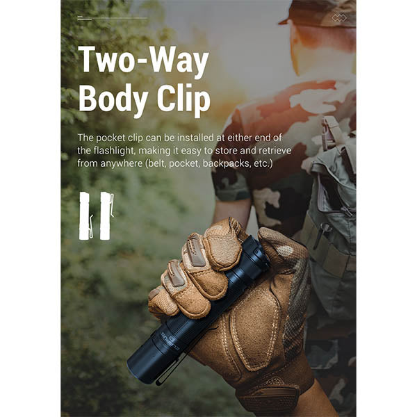 Lieferumfang: E3, Holster, 18650, 5000mAh Akku, Lanyard, USB-Ladekabel, Ersatzdichtung, Bedienungsanleitumg.