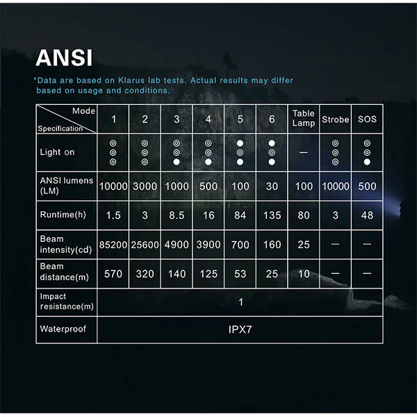 - Tischlampenmodus: 100 Lumen - 80 Stunden - 10 Meter