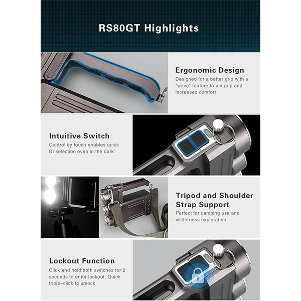 Der neue Klarus RS80GT ist der neueste Suchscheinwerfer mit blendenden 10'000 Lumen. Er taucht sogar im kommenden Film "The Mummy" als bevorzugtes Leuchtmittel für Tom Cruise's Abenteuer auf. Dieses tragbare Kraftpaket kann bis zu 10.000 Lumen ausstrahlen. Ausgestattet mit drei CREE XHP70.2 P2 LEDs, verfügt er über sechs verschiedene Helligkeitsmodi, einen SOS- und Strobemodus, die alle verschiedene Kombinationen der fortschrittlichen LEDs für eine bessere Ausleuchtung verwenden.