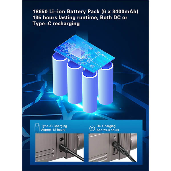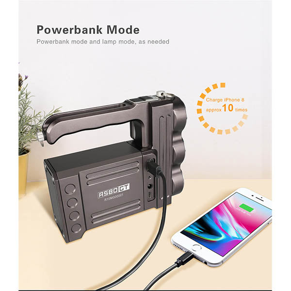 Angetrieben von einem Li-Ionen-Akkupack aus sechs 18650 3400mAh Zellen, hat diese Leuchte extrem lange Laufzeiten und ist hundertmal wiederaufladbar. Der RS80GT verfügt über zwei verschiedene Ladeformen - DC und Typ-C, beide inklusive Ladegeräte. Im Gegensatz zu anderen Suchscheinwerfern verfügt dieser über einen integrierten USB-Anschluss für die Powerbank-Funktion. Mach Dir keine Sorgen, dass Deinem Handy der Saft in der Wildnis oder am Arbeitsplatz ausgeht - mit diesem Suchscheinwerfer kannst Du ein Standard iPhone 10 mal mit einer Ladung aufladen.