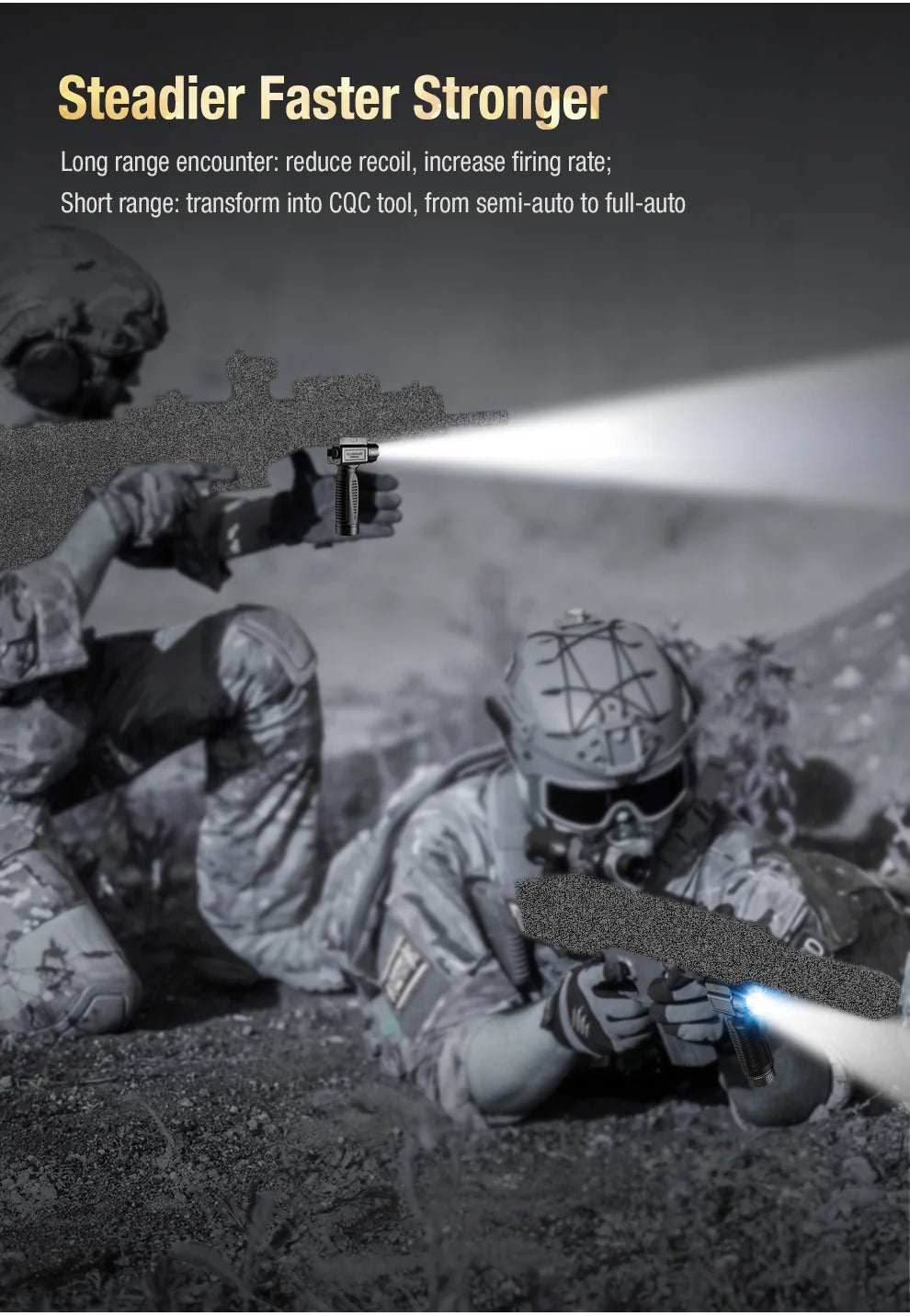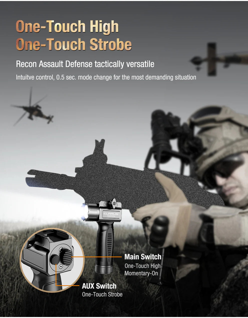 Der Hauptschalter kann die One-Touch-High- und Momentary-On-Funktionen aktivieren und bietet so taktische Optionen. Das One-Touch-Stroboskop kann über den MODE-Schalter aktiviert werden, was Dir in Notsituationen eine Verteidigungslinie bietet.